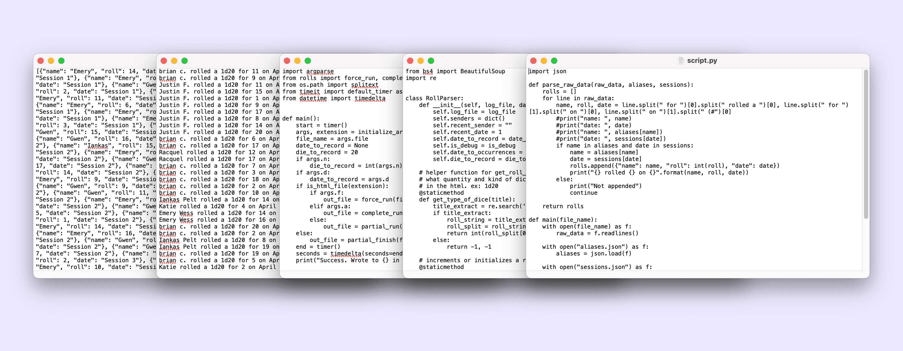 Manually tracking rolls wasn’t realistic, so I used Python. First, I saved the Roll20 log for our campaign. Then I ran it through a modified version of a roll parser, which pulled out each raw roll, who rolled it, and when.